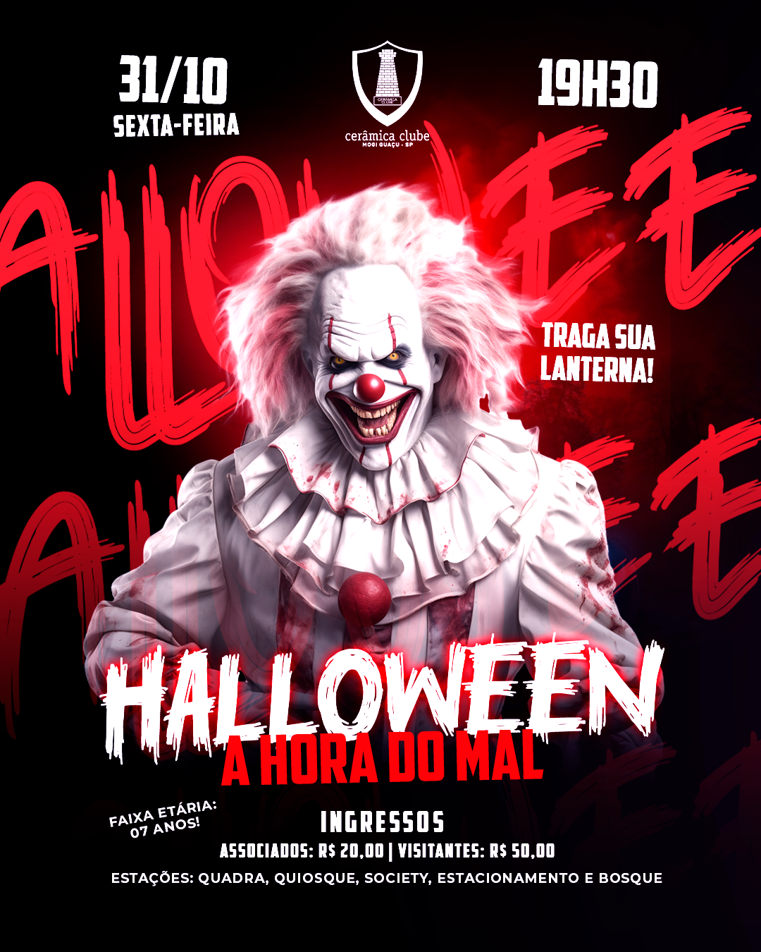 😱 Traga sua lanterna e venha viver momentos sombrios nas estações: quadra, quiosque, society, estacionamento e bosque!